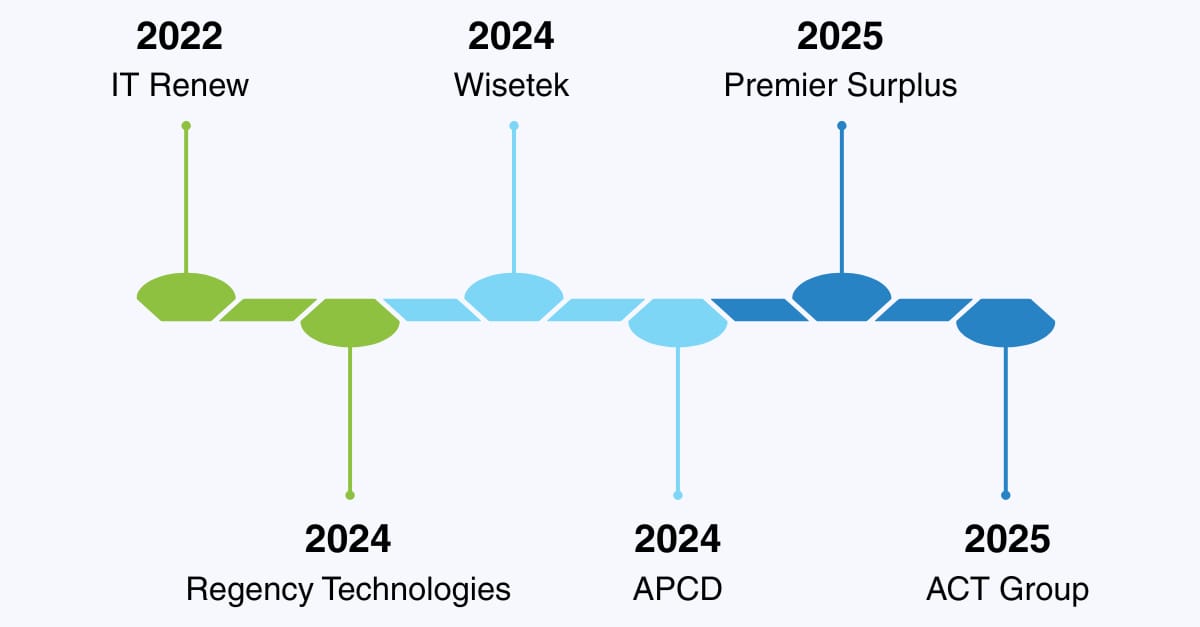 Since 2022, Iron Mountain ALM has pursued an aggressive M&A strategy to consolidate the fragmented ITAD market, acquiring ITRenew (2022), Regency Technologies (2024), Wisetek (2024), APCD (2024), Premier Surplus (2025), and ACT Group (2025). The ACT Group acquisition strengthens Iron Mountain’s presence in APAC, with ACT Logistics, ACT Networks, and Australian Computer Traders adding national facilities, comprehensive logistics capabilities, and remarketing expertise under the ALM umbrella.